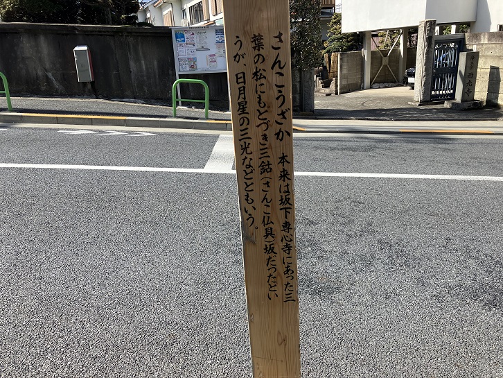 さんこうざか 本来は坂下専心寺にあった三葉の松にもとづき三鈷(さんこ仏具)坂だったというが、日月星の三光などともいう。
