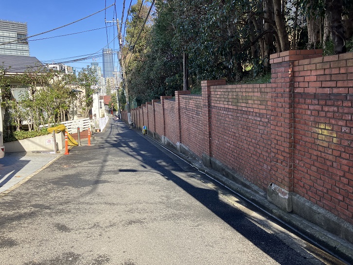 北里研究所の向かいから坂が上っています。坂上には聖心女子学院(中学・高校)があり、赤いレンガ塀が歴史ある坂に溶け込んでいます。