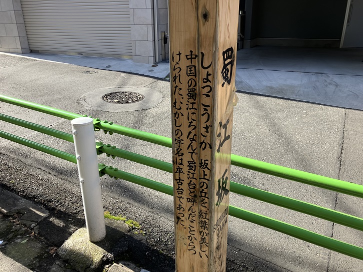 蜀江坂は長さが約170mほどのやや急な坂です。坂上の丘を中国の蜀江に因んで蜀江台と呼んだことから、坂名も同じように名付けられました。坂下と坂上に案内柱が立っています。
