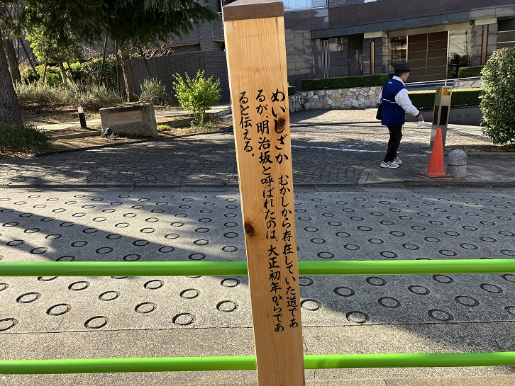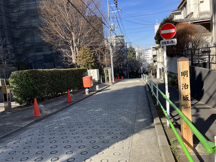 明治坂は長さが約160mほどのやや急な坂です。坂は昔からありましたが、「明治」坂と呼ばれるようになったのは大正時代になってからだそうです。坂下と坂上に案内柱が立っています。