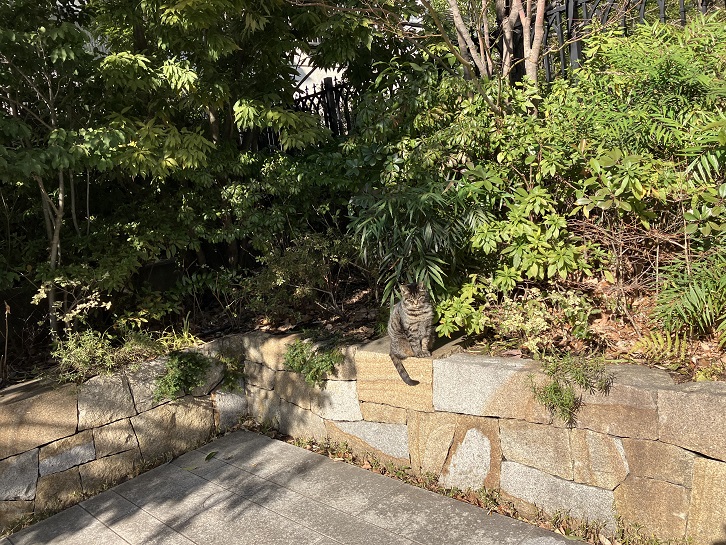 目黒通りの白金台交差点から約1km続く外苑西通りの別名は「プラチナ通り」と呼ばれています。「白金」がプラチナを意味することから通り名が付けられました。プラチナ通りにはイチョウ並木沿いにおしゃれなカフェやレストラン、それに高級ショップが軒を連ねています。洗練された街の雰囲気に合う女性を「シロガネーゼ」と呼んで、マスコミに取り上げられたことから一躍有名になりました。尤も、地元民は「白金」を「シロカネ」と読むんですけど。そんなハイソな通りの石垣の上で猫が日向ぼっこをしています。カメラを向けても身じろぎもしませんね。