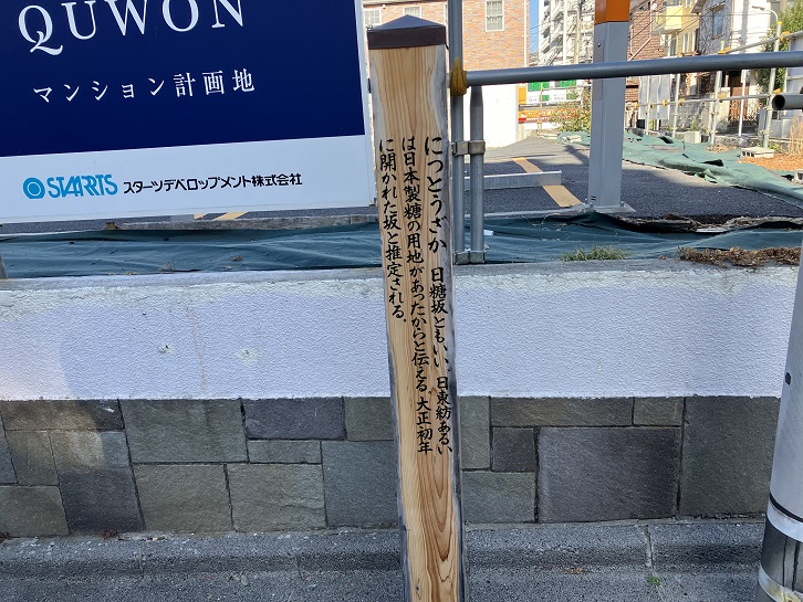 日東坂は長さが約150mほどの緩やかな坂です。別名を「日糖坂」といいます。坂名は、かってこの辺りに日東紡あるいは日本製糖の用地があったことに由来しています。坂下と坂上に案内柱が立っています。