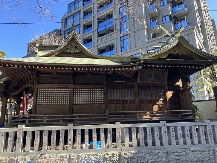 広尾稲荷神社の拝殿の天井には、日本洋画家の先駆者である高橋由一の日本画最後の作の龍が描かれていて港区の指定文化財となっています。