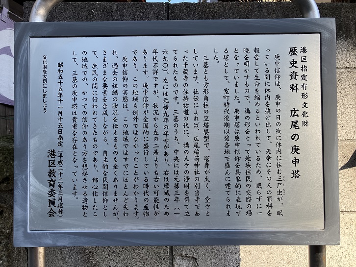 庚申信仰は、庚申の日の夜に体内に住む三尸虫が、眠っている間に体内を抜け出して、天帝にその人の罪科を報告して生命を縮めるといわれているため、眠らずに一晩を明かすもので、講の形をとって地域住民の交際の場となっていました。庚申塔は庚申信仰を具象的に表現する塔として、室町時代後期以後各地で盛んに建てられました。三基とも方形角柱の笠塔婆型で、塔身が太く、堂々としています。社伝によれば、広尾稲荷神社の別当寺であった千蔵寺の住持祐道の代に、講の人々の浄財を得て立てられたものです。三基のうち、中央には元禄三年(1690年)、左には元禄九年の年号があり、右は摩滅のため年代不詳ですが、状況から左の二基よりも古い可能性があります。庚申信仰が全国的に盛行している時代の産物であり、この地域も例外ではなかったことがわかります。庚申信仰の実態は、この地域ではすでにほとんど失われ、過去の組織の状況を伝えるものも全くありませんが、さまざまな要素を合成しながら、自主的な民間信仰として、庶民の間に行われてきたものであり、都心化したこの地域での、かつての信仰のあり方を想起させる遺物として、三基の庚申塔は貴重な存在となっています。