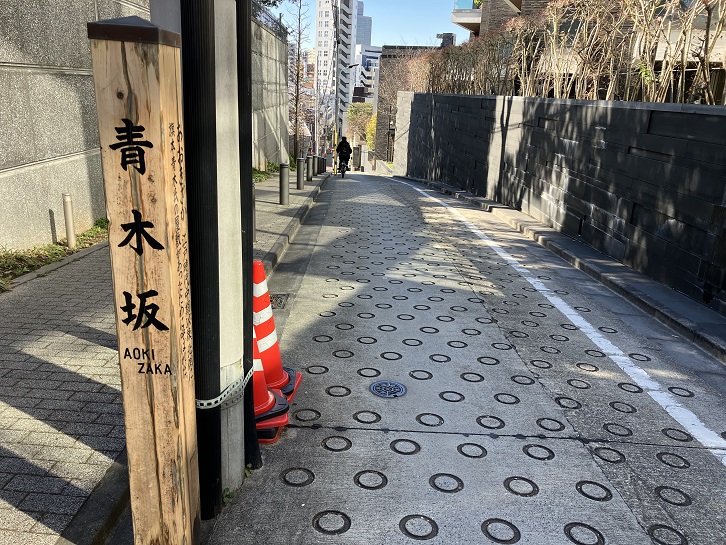 青木坂は長さが約100mほどのやや急な坂で、別名を「富士見坂」といいます。坂名は、江戸時代に坂の北側に旗本の青木氏の屋敷があったことに因んでいます。坂上と坂下に案内柱が立っています。