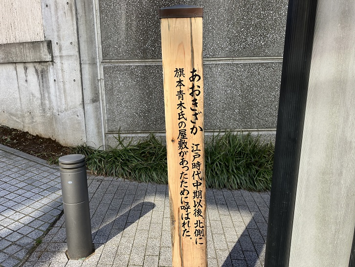 あおきざか 江戸時代中期以後、北側に旗本青木氏の屋敷があったために呼ばれた。