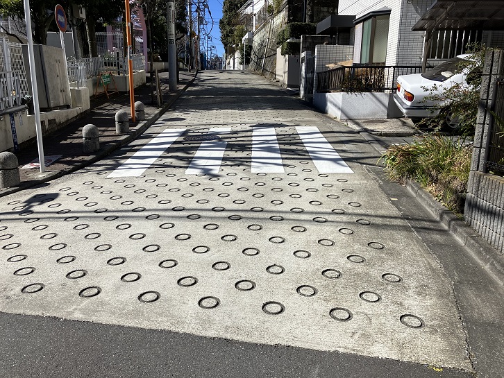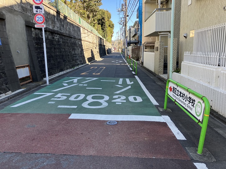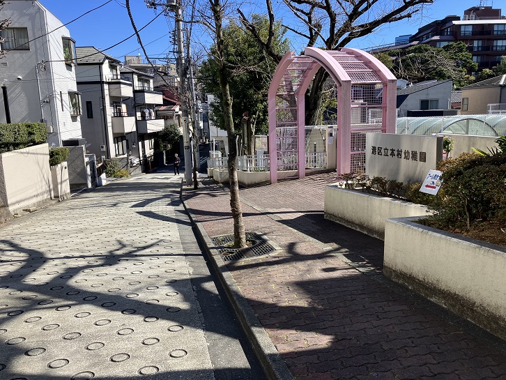 新坂の坂上を右折してフィンランド大使館の石垣に沿って緩やかな坂を進みますと、本村小学校に隣接する本村幼稚園の前で急な下り坂になっています。
