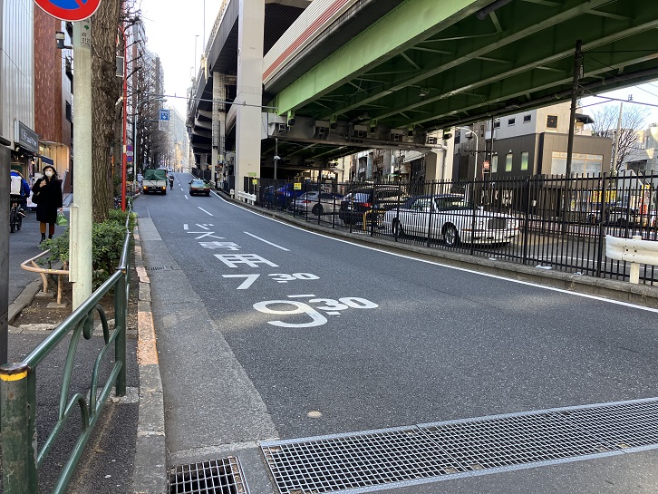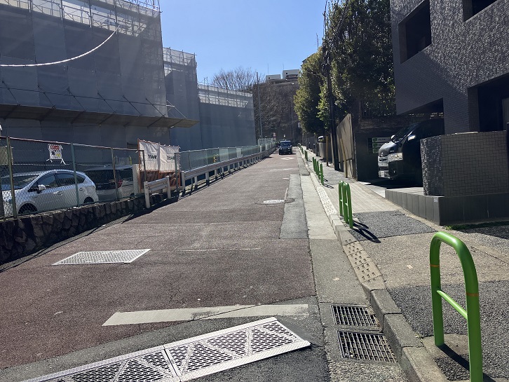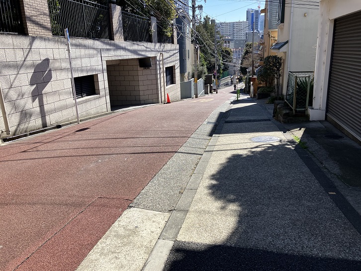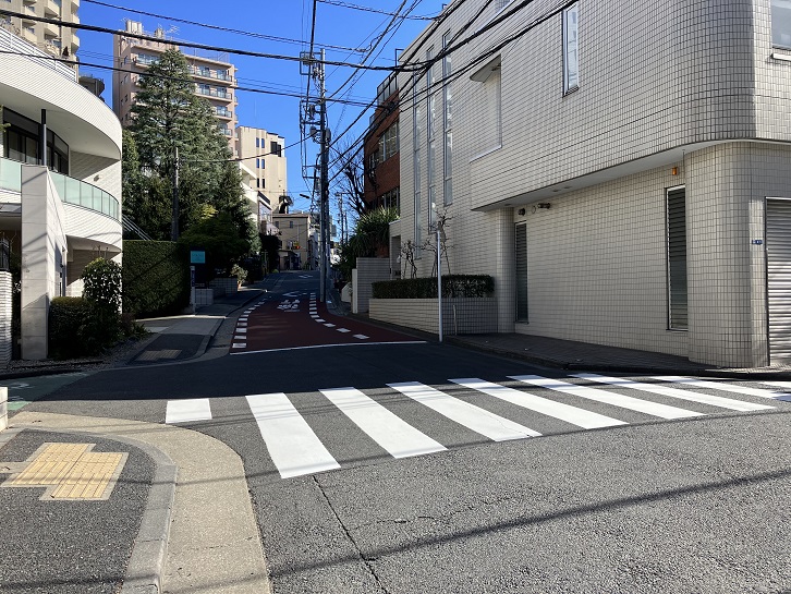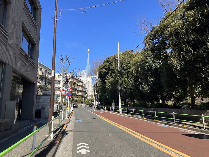 愛育病院前交差点で左斜めの方向に進みますと、外苑西通りまで坂が下っています。