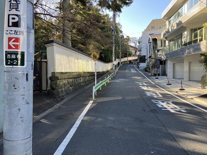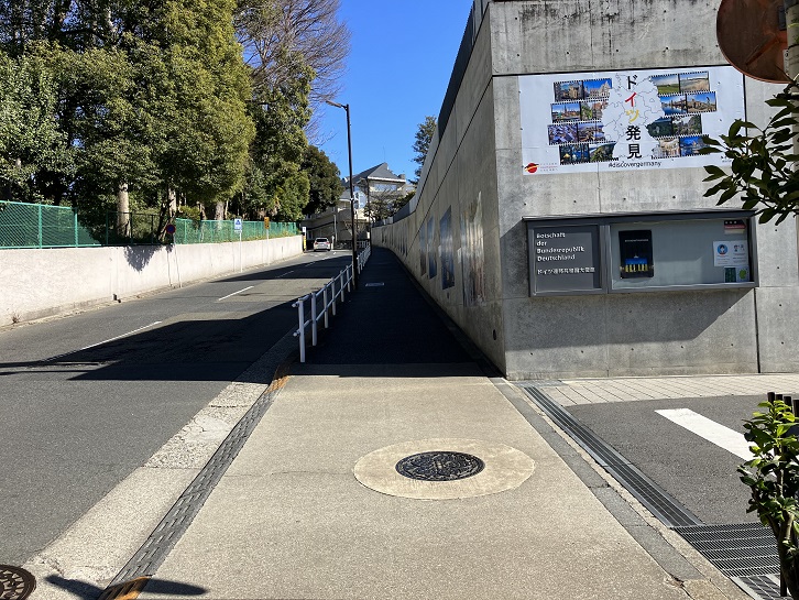有栖川宮記念公園の南側のドイツ大使館前に坂が下っています。