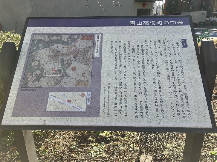 高木町交差点脇の植え込みの中に、青山高木町の由来を記した案内板が置かれています。