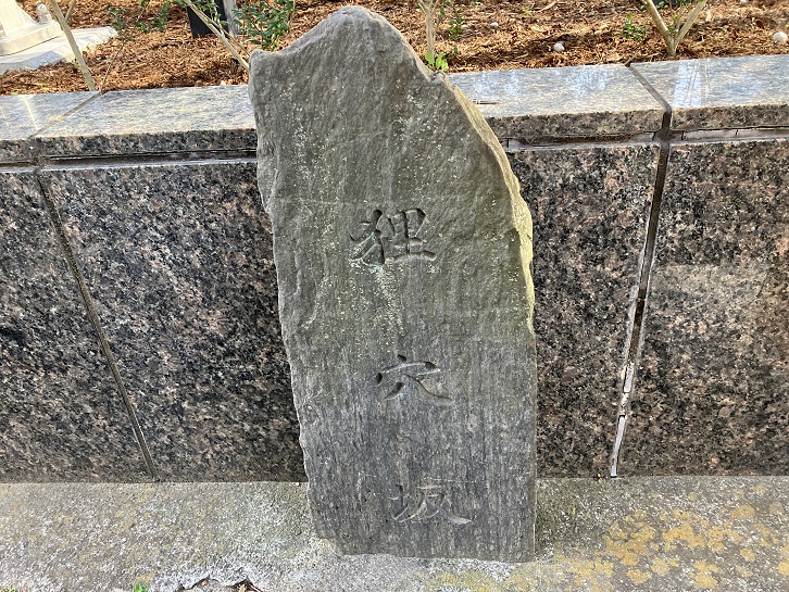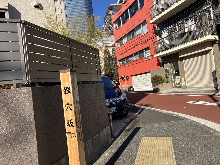 狸穴坂は長さが約250mほどのやや急な坂です。坂名の由来は、タヌキの巣穴が坂下にあったためとか、採鉱の穴との説があります。坂上と坂下の交差点脇に案内柱が立っています。