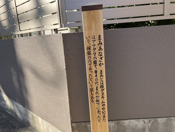 まみあなざか まみとは雌ダヌキ・ムササビまたはアナグマの類で、昔その穴(まぶ)が坂下にあったという。採鉱の穴であったという説もある。
