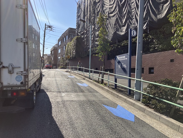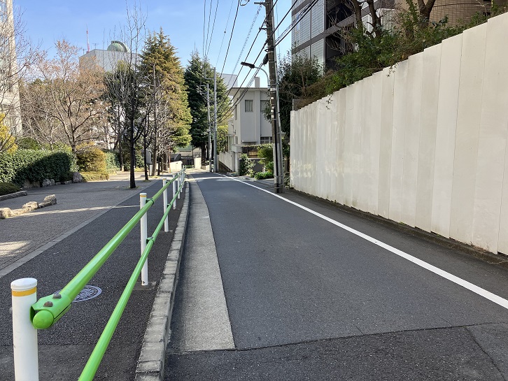 霞坂の坂上の交差点を右折して路地を進みますと、突き当たりに長い坂があります。坂下は外苑西通りにつながり、坂上はテレビ朝日通りに出ています。坂下付近にはルーマニア大使館があります。