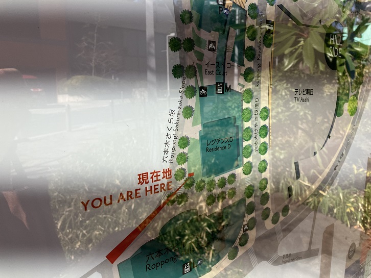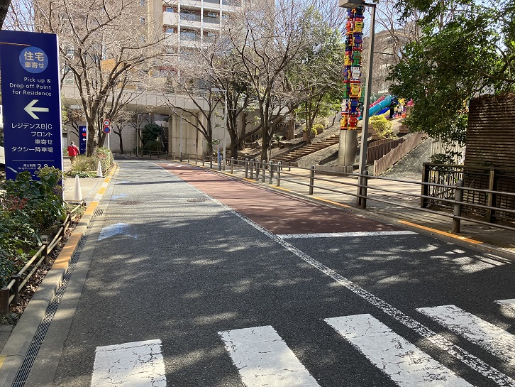 六本木ヒルズのレジデンス棟の南側の外周に沿って坂が下っています。