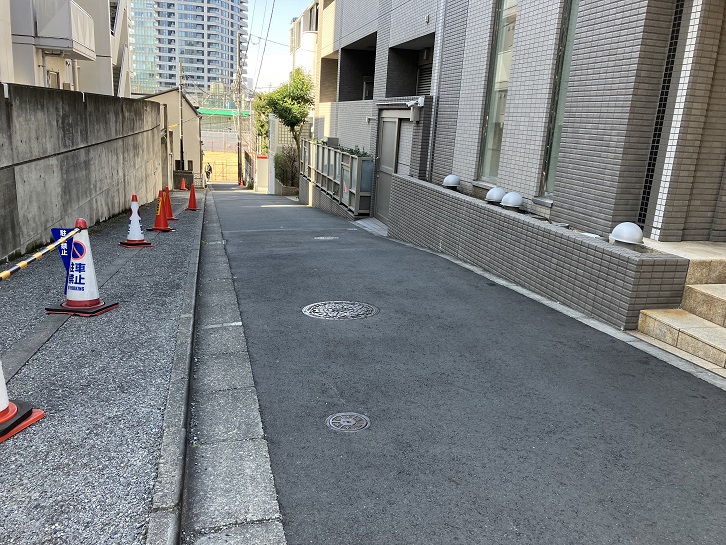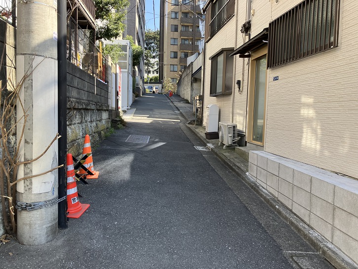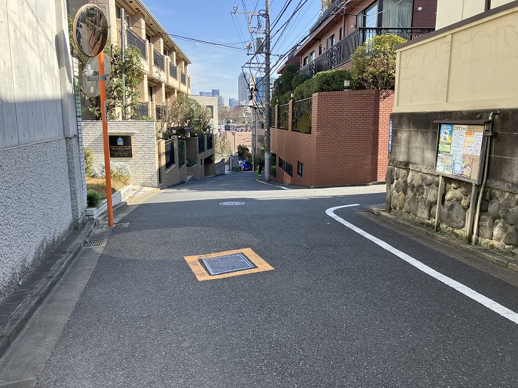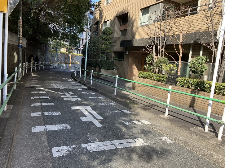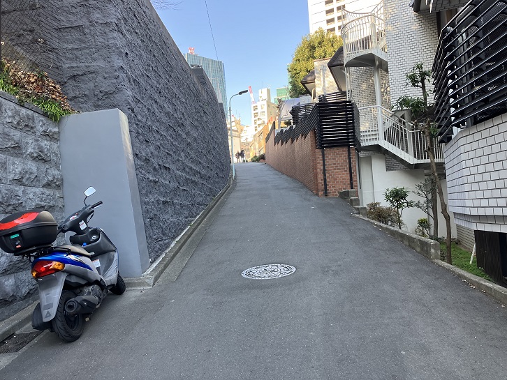 鳥居坂の坂上で右折しますと、シンガポール大使館の先から高級マンションの敷地に沿ってクランク状の坂が下っています。