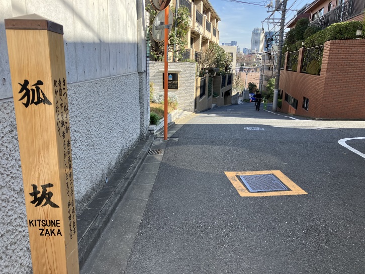 狐坂は長さが約170mほどの左右に曲がりながら下るやや急な坂で、別名を「大隅坂」といいます。昔は寂しいところで、狐が時々人を化かしたということから坂名が付けられました。「大隅坂」という別名は、この辺り一帯が山のような地形であったことから通称「大隅山」と呼ばれ、それが坂の別名になりました。狐坂の坂下手前の麻布浄苑の向かいから宮村坂に繋がるマンションの私道が始まっています。