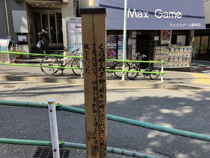 この坂は「MAJES元麻布ガーデンズ」という高級マンションの敷地内にある私道の一部です。私道は狐坂までの200mほどが石畳風の舗装をされていて、両側には3階建ぐらいの低層マンションが並んでいます。坂名の由来は、かって存在した宮村町という町域にある坂ということに因んで宮村坂と呼ばれるようになりました。