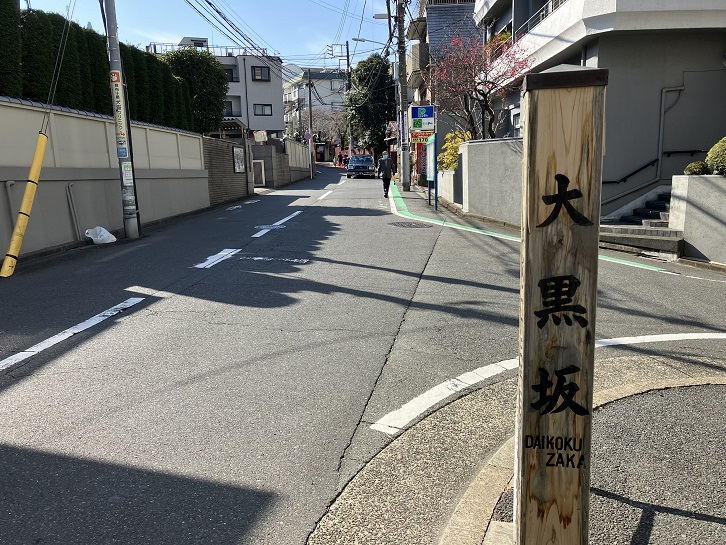 だいこくざか 大国坂とも書く。坂の中腹北側に大黒天(港区七福神のひとつ)をまつる大法寺があったために呼んだ坂名である。