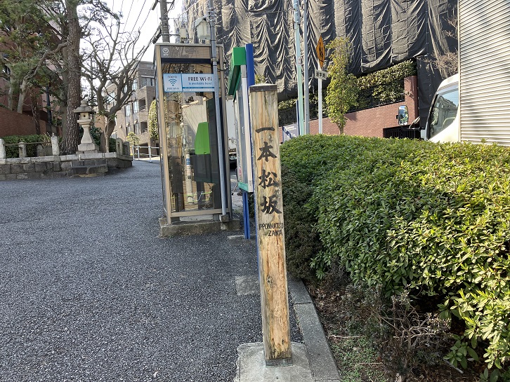 一本松坂は長さが約55mほどの緩やかな坂です。別名を「相生坂・大黒坂」といいます。坂名の由来は、坂下の南側に一本松があるに因んでいます。一本松にはいくつかの伝説があり、代表的なものは、源経基がこの近くの民家に宿を求め、翌朝この木に装束をかけて麻の狩衣に着替えたというものです。現在の一本松はマンションの前に聳えていて、植え継がれて四代目といわれています。坂下の一本松の前に案内柱が立っています(電話ボックスの左後方の囲いの中に一本松が植わっています)。