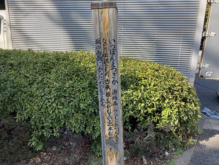いっぽんまつざか 源経基(みなもとのつねもと)などの伝説をもち、古来、植えつがれている一本松が、坂の南側にあるための名である。