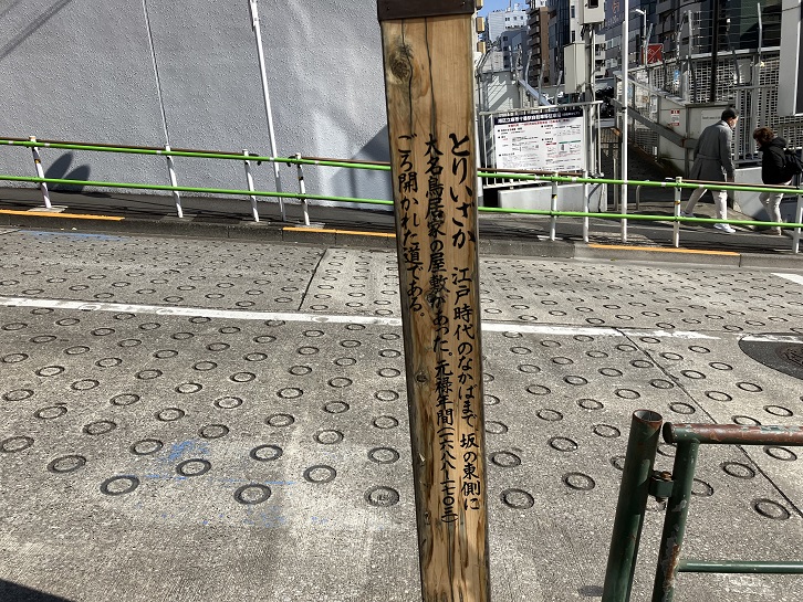 とりいざか 江戸時代のなかばまで、坂の東側に大名鳥居家の屋敷があった。元禄年間(1688年〜1703年)ごろ開かれた道である。