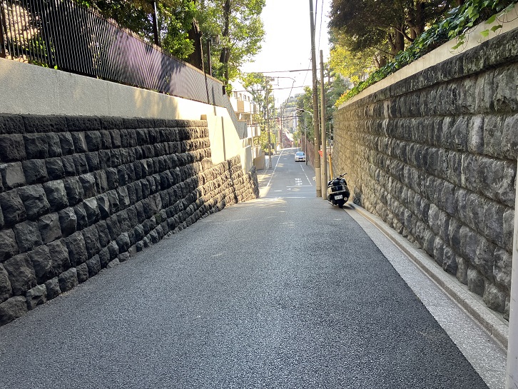 ロシア大使館の西側の石垣に沿って外苑東通りまで坂が上がっています。