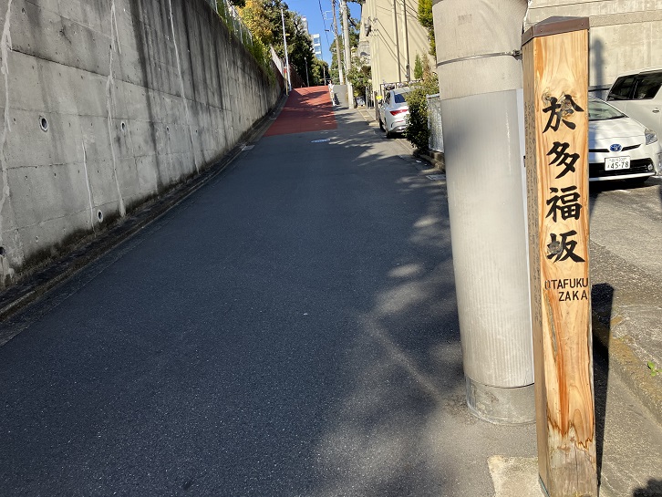 於多福坂は長さが約200mほどのやや急な坂です。坂の途中で傾斜が変わり、中央に平坦な区間があります。坂名の由来は、坂の途中で傾斜が緩やかになってまた上るのがお多福面のようだということに因んでいます。坂下と坂上に案内柱が立っています。