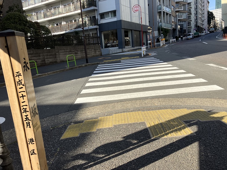 永坂は長さが約280mほどの緩やかな坂ですが、坂上付近は急坂になっていて歩道部分が階段になっています。別名を「長坂」といいます。坂名の由来は、長い坂であったことが坂名の由来とする説と、坂の近くに長坂氏が住んでいたことでこの坂名になったという説があります。坂下と坂上に案内柱が立っています。