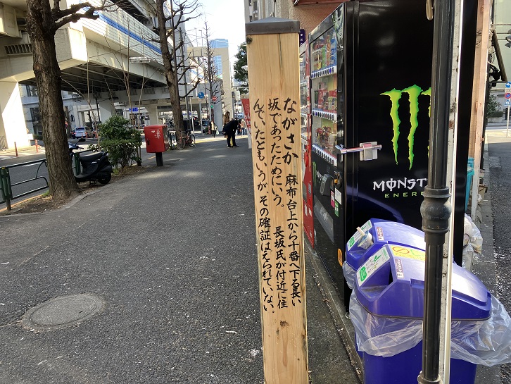 ながさか 麻布台上から十番へ下る長い坂であったためにいう。長坂氏が付近に住んでいたともいうが、その確証はえられていない。