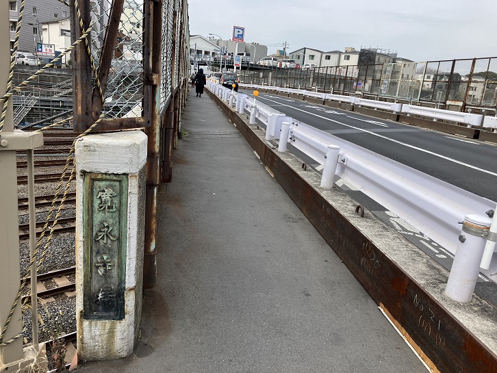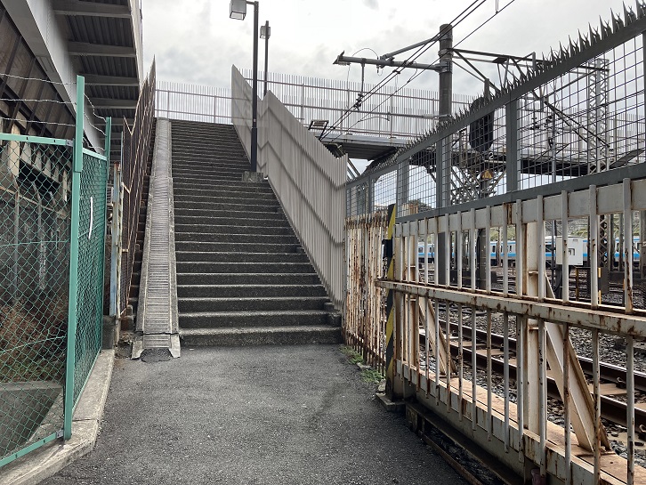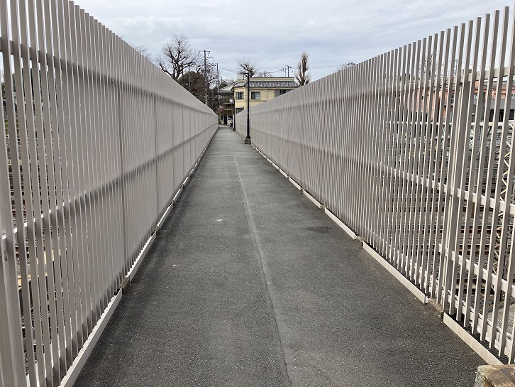 羽二重団子のお店の脇の路地を進みますと、JR線の線路にぶつかります。左手に階段があり、JR線を跨いだ跨線歩道橋になっています。