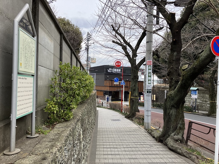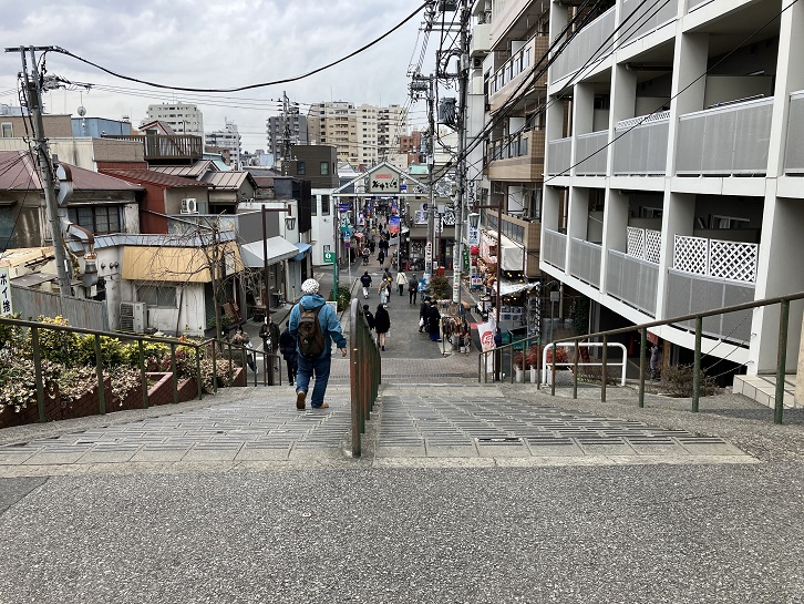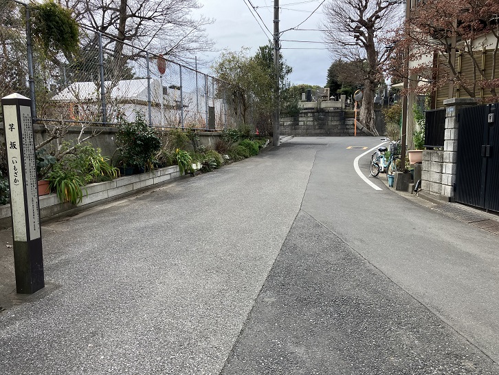 芋坂は階段と跨線歩道橋とその先の坂を含めて長さが約150mほどあります。坂名の由来は、この付近で自然薯(山芋)が採れたことに因んでいます。坂下に案内柱が立っています。