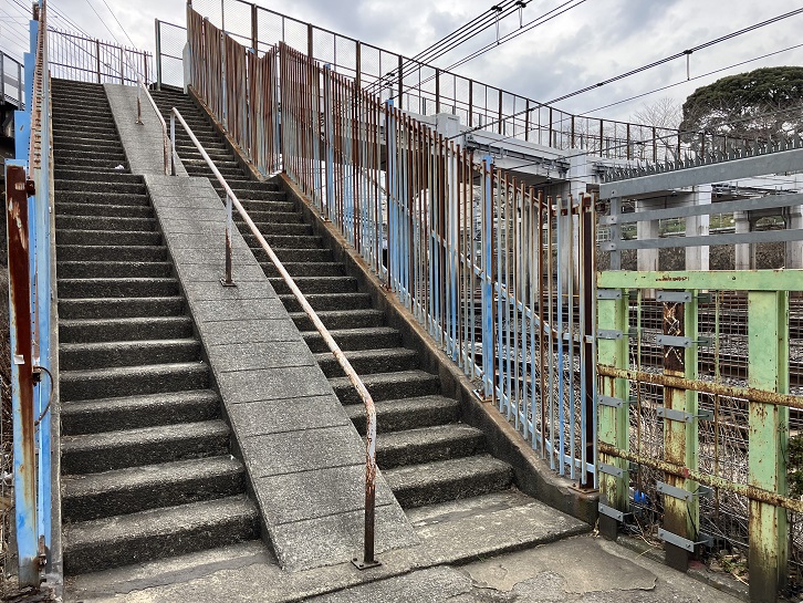坂下はJRの線路を跨ぐ跨線歩道橋に繋がっていて、その先は根岸に下りる階段になっています。
