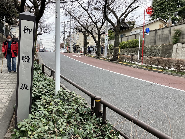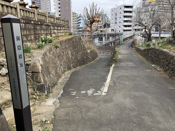 御殿坂は長さが約180mほどの僅かに左に曲がりながら緩やかに下る坂で、別名を「乞食坂」といいます。坂名の由来は、「御隠殿」と呼ばれた輪王寺宮の隠居所がこの先にあったからといわれたことに因んでいます。坂下付近に案内柱が立っています。