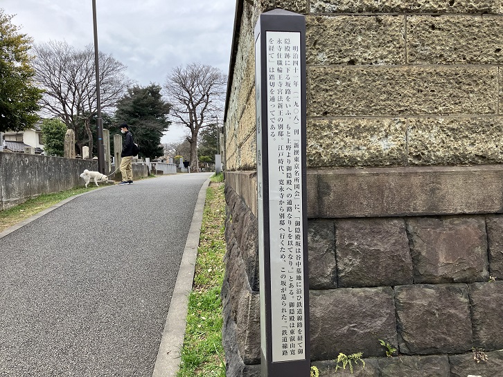 御隠殿坂は長さが約60mほどあり、別名を「御院殿坂」といいます。坂名の由来は、上野の山から御隠殿への通路だったことに因んで名付けられました。御隠殿は寛永寺の住職の輪王寺宮法親王の別邸で、根岸側の線路近く(現在の跨線橋を下りたあたり)にあり、寛永時本坊で公務を執られていた宮が時折り息抜きに滞在された屋敷です。敷地は三千数百坪あり、老松の林に囲まれた池を持つ優雅な庭園もありました。庭園から眺める月が美しかったといわれています。慶応四年(1868年)の上野戦争によって焼失し、現在は全くその跡を留めていません。かつて御隠殿坂は踏切で線路を超えていましたが、昭和三年頃に跨線橋(御隠殿坂橋)が建設された際に谷中墓地から踏切までの急坂は消滅しました。跨線橋の手前で左に分岐する道路跡が残っていますが、これが踏切まで繋がっていたかっての御隠殿坂であったと考えられます。坂下の跨線歩道橋の手前に案内柱が立っています。