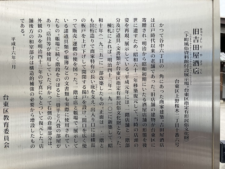 その酒屋の店名は「吉田屋酒店」です。吉田類さんの実家です。。。ということはありません。上野桜木交差点に面して旧家屋が保存・展示されています。