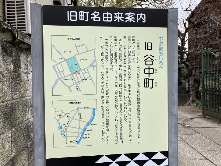 先日道を間違えて辿り着けなかった谷中銀座に向かいます。谷中町の旧町名由来案内板が立っています。