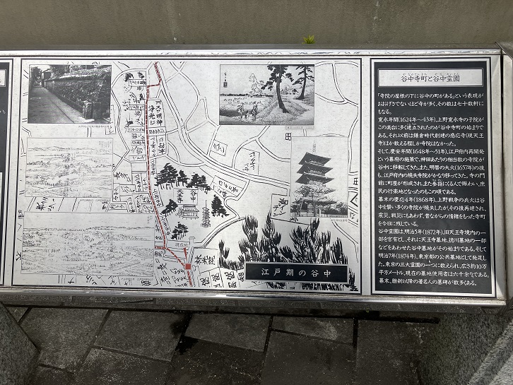 谷中霊園の入口の手前に歴史と文化の散歩道の案内板が置かれています。
