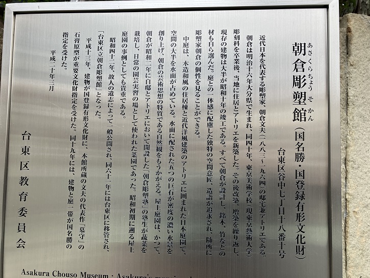 近代日本を代表する彫塑家、朝倉文夫(1883年〜1964年)の邸宅兼アトリエである。朝倉は明治十六年大分県で生まれ、同四十年、東京美術学校(現東京藝術大学)彫刻科を卒業後、当地に住居とアトリエを新築した。その後改築、増築を繰り返し、現存の建物は大半が昭和十年の竣工である。すべて朝倉が設計し、銘木、竹などの材も自ら選んだ。庭との一体感に配慮した独特の空間意匠、造詣が追求され、随所に彫塑家朝倉の個性を見ることができる。中庭は、木造和風の住居棟と近代洋風建築のアトリエに囲まれた日本庭園で、空間の大半を水面が占めている。水面に配された五つの巨石が密度の濃い水景を創り上げ、朝倉の芸術思想の特質である自然観をもうかがえる。屋上庭園は、かつて、朝倉が昭和二年に自邸とアトリエにおいて開設した「朝倉彫塑塾」の塾生が蔬菜(そさい:野菜の総称の総称)を栽培し、日常の園芸実習の場として使われた菜園であった。昭和初期に遡る屋上庭園の事例としても貴重である。昭和四十二年、故人の遺志によって一般公開され、同六十一年には台東区に移管され、「台東区立朝倉彫塑館」となった。平成十三年、建物が国登録有形文化財に、本館所蔵の文夫の代表作「墓守」の石膏原型が重要文化財指定を受けた。同十九年には、建物と庭一帯が国名勝の指定を受けた