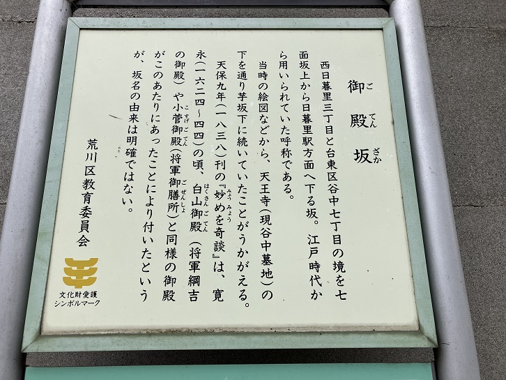 御殿坂は台東区と荒川区の境界になっています。ということで、本行寺の石垣の上に荒川区の案内板も立っています。