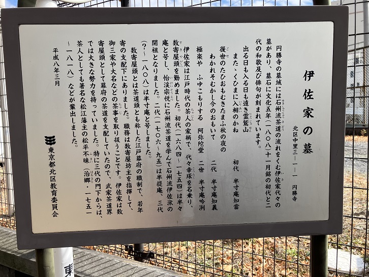 円勝寺の墓域には石州流茶道の流れをくむ伊佐家代々の墓があり、墓石に文化五年(1808年)十一月銘の初代と二代の和歌及び俳句が刻まれています。