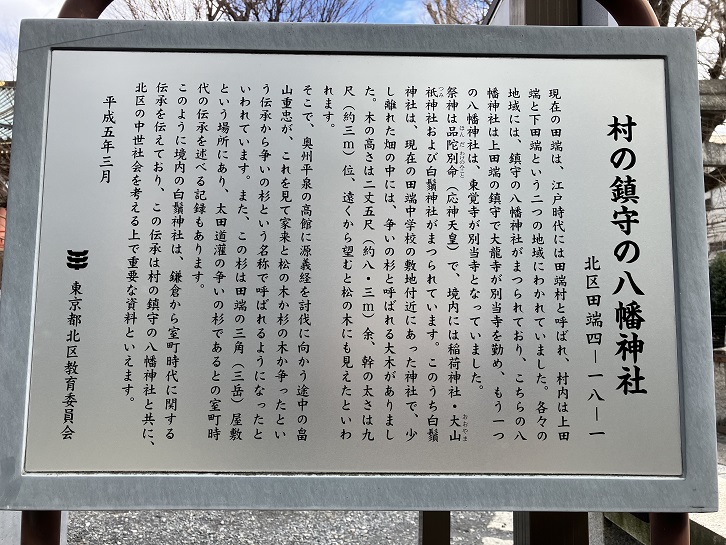 現在の田端は、江戸時代には田端村と呼ばれ、村内は上田端と下田端という二つの地域にわかれていました。各々の地域には、鎮守の八幡神社がまつられており、こちらの八幡神社は上田端の鎮守で大龍寺が別当寺を勤め、もう一つの八幡神社は、東覚寺が別当寺となっていました。祭神は品陀別命(応神天皇)で、境内には稲荷神社・大山祇神社および白鬚神社がまつられています。このうち白鬚神社は、現在の田端中学校の敷地付近にあった神社で、少し離れた畑の中には、争いの杉と呼ばれる大木がありました。木の高さは二丈五尺(約8.3m)余、幹の太さは九尺(約3m)位、遠くから望むと松の木にも見えたといわれます。そこで、奥州平泉の高館に源義経を討伐に向かう途中の畠山重忠が、これを見て家来と松の木か杉の木か争ったという伝承から争いの杉という名称で呼ばれるようになったといわれています。また、この杉は田端の三角(三岳)屋敷という場所にあり、太田道灌の争いの杉であるとの室町時代の伝承を述べる記録もあります。このように境内の白鬚神社は、鎌倉から室町時代に関する伝承を伝えており、この伝承は村の鎮守の八幡神社と共に、北区の中世社会を考える上で重要な資料といえます。