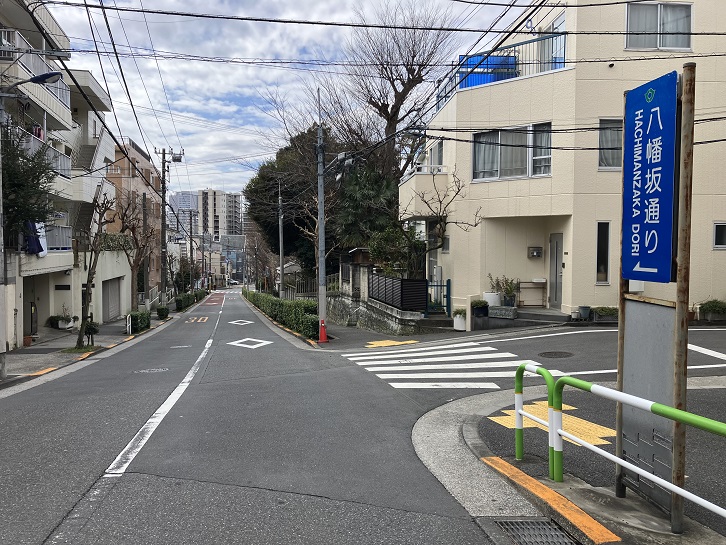 上田端八幡神社の南東側に沿って、八幡坂通りが上り坂になっています。