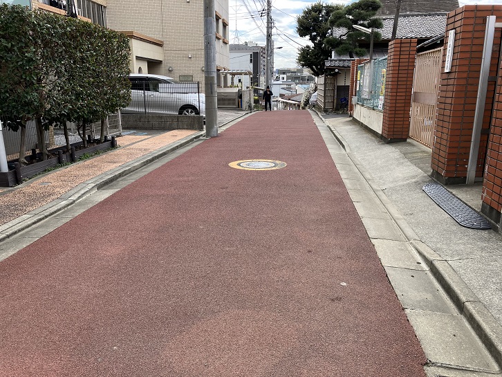 八幡坂から少し東側にある田端保育園の前から、赤い絨毯を敷いたような坂が下っています。