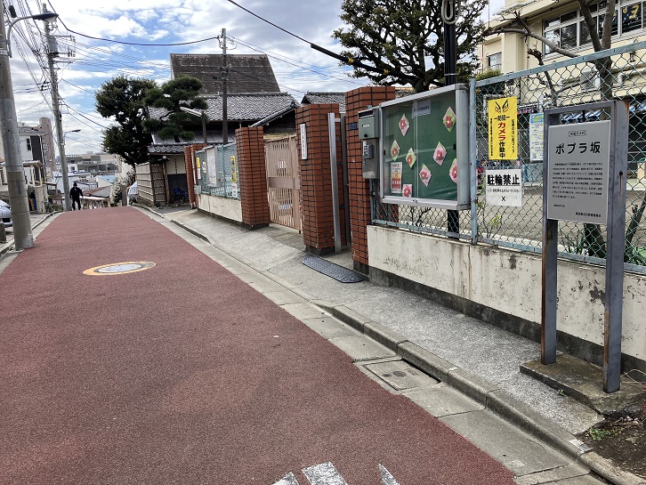 ポプラ坂は長さが約65mほどのやや急な坂です。坂名は、明治末期に此の地にあった「ポプラ倶楽部」というテニスコートに因んでいます。坂上の田端保育園前に案内板が立っています。