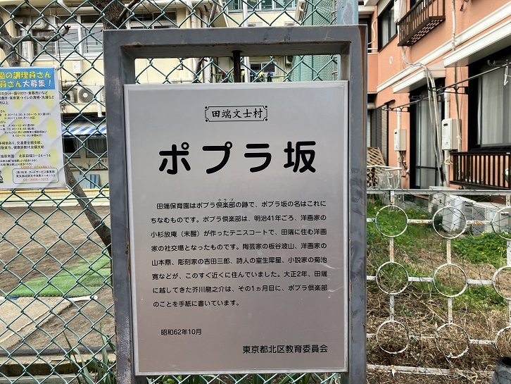 田端保育園はポプラ倶楽部の跡で、ポプラ坂の名はこれにちなむものです。ポプラ倶楽部は、明治四十一年ごろ、洋画家の小杉放庵(未醒)が作ったテニスコートで、田端に住む洋画家の社交場となったものです。陶芸家の板谷波山、洋画家の山本鼎、彫刻家の吉田三郎、詩人の室生犀星、小説家の菊池寛などが、このすぐ近くに住んでいました。大正二年、田端に越してきた芥川龍之介は、その1カ月目に、ポプラ倶楽部のことを手紙に書いています。
