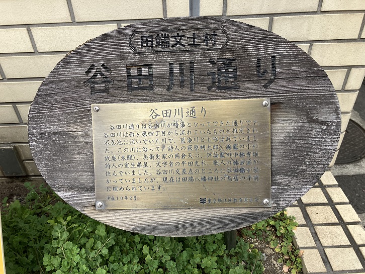 谷田川通りは谷田川が暗渠となってできた通りです。谷田川は西ヶ原四丁目から流れていたものと推定され不忍池に注いでいた川で、藍染川とも呼ばれていました。この川に沿って、詩人の萩原朔太郎、画家の小杉放庵(未醒)、美術史家の岡倉天心、評論家の小林秀雄、詩人の室生犀星、文学者の平田禿木、歌人の林古溪が住んでいました。谷田川交差点のところに谷田橋が架かっていましたが、現在は田端八幡神社の鳥居の手前に埋められています。