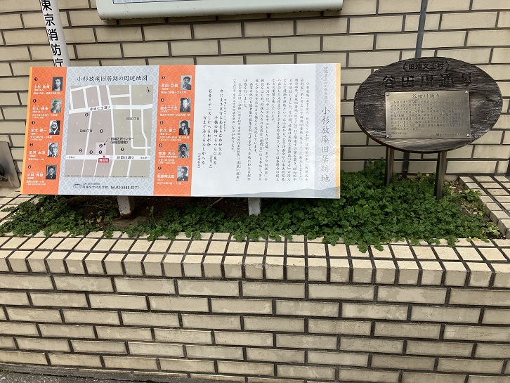 谷田川通りの案内板の隣に、「小杉放庵旧居跡」の案内板が並んで置かれています。