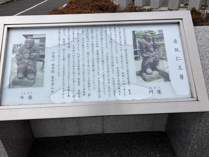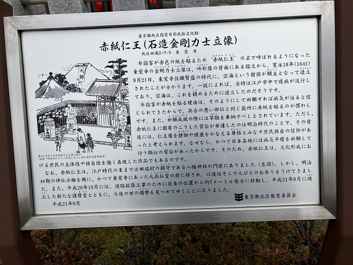 石仏仁王の背銘に「施主道如宗海上人東岳寺賢盛代、寛永十八辛巳天八月廿一日」と刻まれている。西暦1641年より露仏で立っていることになる。仁王は、本来清浄な寺院の境内を悪から守る金剛力士として山門の両側に立ち、仏法僧の三宝を守護するものであるが、この赤紙仁王は当時江戸市中に流行していた疫病を鎮めるため宗海上人が願主となって建立されたもので、いつのころからか赤紙(悪魔を焼徐する火の色)を自分の患部と同じ箇所に貼って病気身代りと心身安穏を願うようになった。右の阿像は口を大きく開けて息を吸い込んでいる状態即ち「動」を表し、左の吽像は口をしっかりと結んで息を止めている状態即「静」を表している。阿吽の姿は密教で説く胎蔵界、金剛界の二界を表し、又宇宙一切のものの始めと終りを表している。阿像から吽像へと祈願し、満願のあかつきにはお礼として草鞋を奉する。祈願者、病人を見舞うため日夜歩かれるのでさぞかし草鞋が必要であろうという思いやりからである。