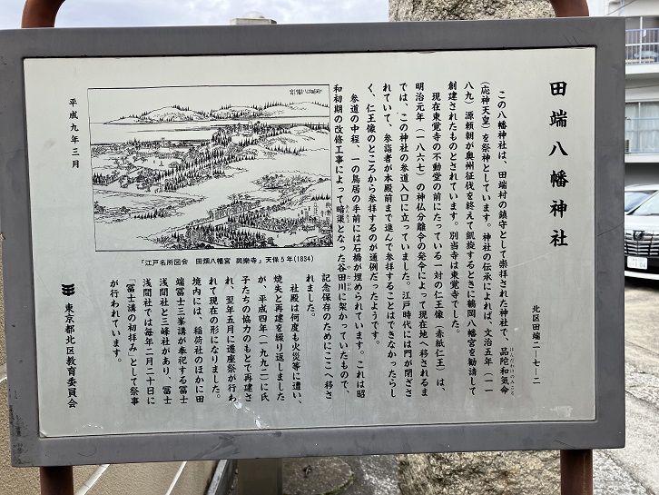 この八幡神社は、田端村の鎮守として崇拝された神社で、品陀和気命(応神天皇)を祭神としています。神社の伝承によれば、文治五年(1189年)源頼朝が奥州征伐を終えて凱旋するときに鶴岡八幡宮を勧請して創建されたものとされています。別当寺は東覚寺でした。現在東覚寺の不動堂の前にたっている一対の仁王像(赤紙仁王)は、明治元年(1867年)の神仏分離令の発令によって現在地へ移されるまでは、この神社の参道入口に立っていました。江戸時代には門が閉ざされていて、参詣者が本殿前まで進んで参拝することはできなかったらしく、仁王像のところから参拝するのが通例だったようです。参道の中程、一の鳥居の手前には石橋が埋められています。これは昭和初期の改修工事によって暗渠となった谷田川に架かっていたもので、記念保存のためにここへ移されました。社殿は何度も火災等に遭い、焼失と再建を繰り返しましたが、平成四年(1992年)に氏子たちの協力のもとで再建され、翌年五月に遷座祭が行われて現在の形になりました。境内には、稲荷社のほかに田端冨士三峯講が奉祀する冨士浅間社と三峰社があり、冨士浅間社では毎年二月二十日に「富士講の初拝み」として祭事が行われています。