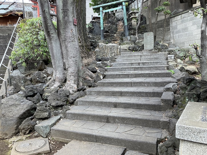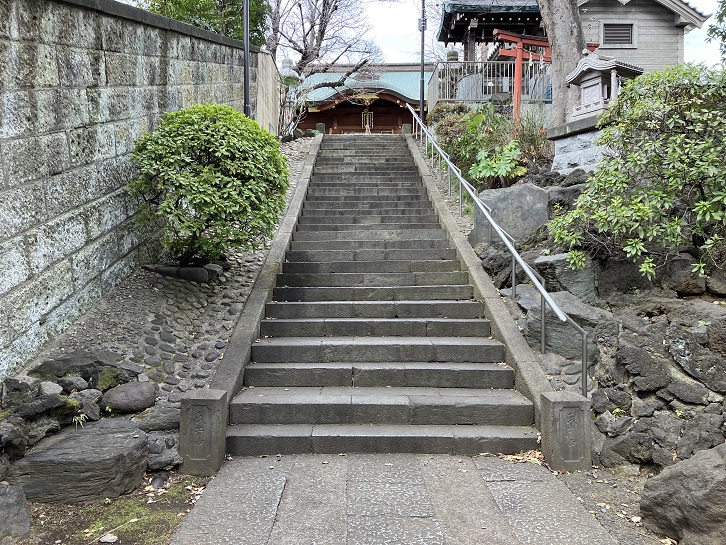 田端八幡男坂の石段上の左手に、踊り場の付いた緩やかな石段が下りています。